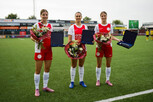 Zaterdag waren er maar liefst drie speelsters van Vrouwen 1 die de mijlpaal van honderd wedstrijden hebben bereikt. Ze werden door IJsselmeervogels-voorzitter Ruud van Diermen gehuldigd.