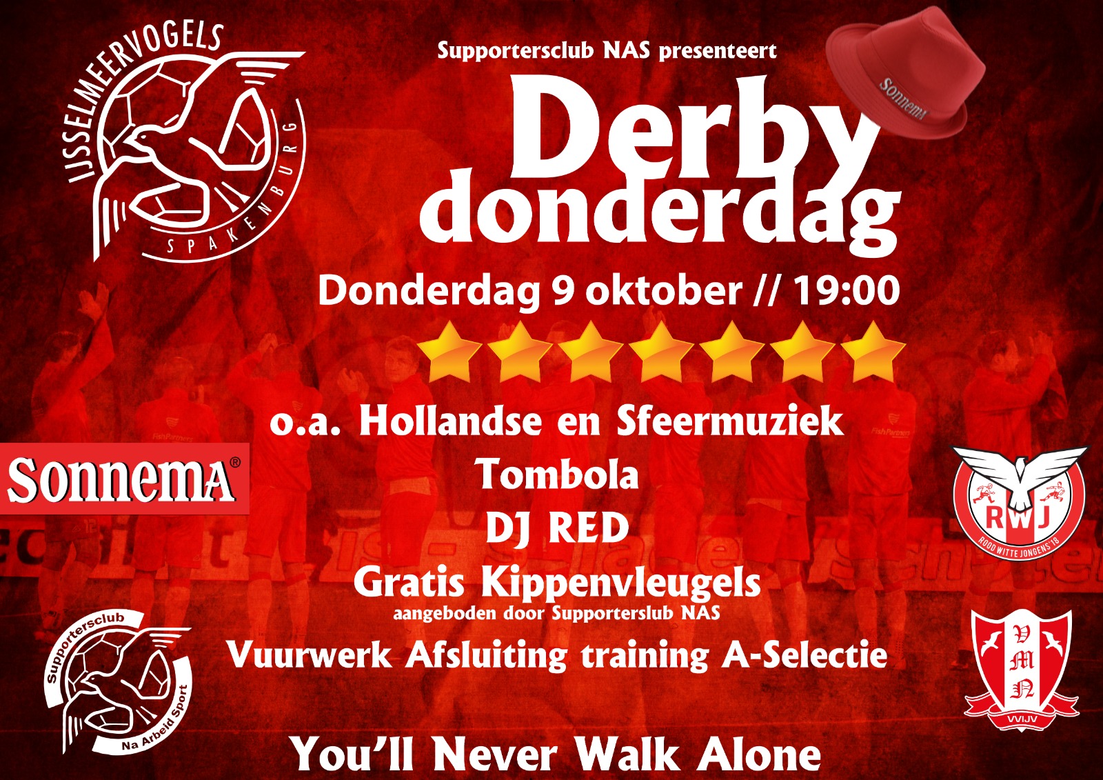 Donderdag 9 oktober is het weer zover: Derby donderdag!. Vanaf 19:00 uur bent u van harte uitgenodigd in onze kantine om de spelers en elkaar helemaal klaar te maken voor de derby van zaterdag 11 oktober.