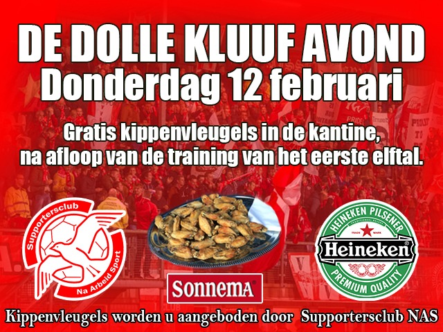 Aanstaande donderdag is het weer eens tijd voor een ouderwetse Dolle Kluuf Avond. Supportersclub Na Arbeid Sport (NAS) sponsort de kippenvleugels!