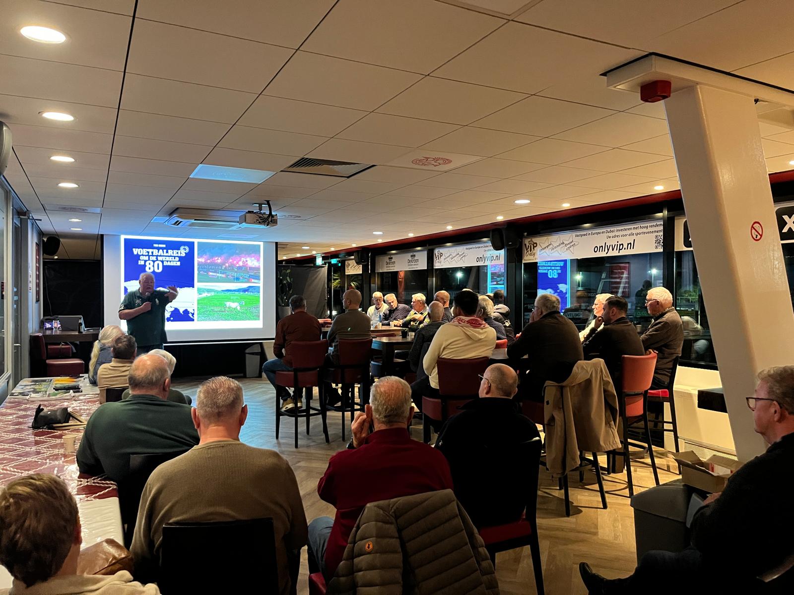 Daarna was het tijd voor de speciale gast van de avond: Tom Bodde. Deze wereldreiziger, groundhopper en schrijver heeft inmiddels meer dan 2.000 voetbalstadions wereldwijd bezocht en legde zijn avonturen vast in woord en beeld. Aan de hand van een indrukwekkende presentatie vol kleurrijke foto’s nam hij het publiek mee op reis langs stadions in Oost-Europa, Zuid-Amerika, Azië en Afrika. Van verlaten betonkolossen in de voormalige Sovjet-Unie tot bruisende voetbaltempels in Buenos Aires en van geïmproviseerde veldjes in Afrika tot hypermoderne arena’s in Japan. Overal ter wereld genoot Tom van de unieke sfeer en cultuur die voetbal zo bijzonder maakt.