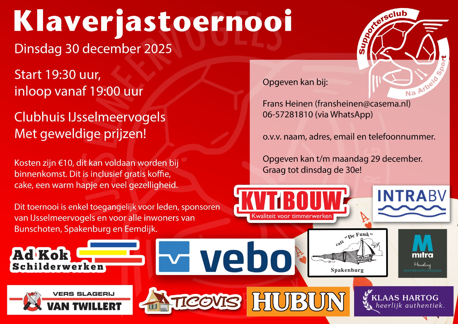De afgelopen jaren is eigenaar Klaas van Twillert met zijn bedrijf K.V.T Bouw een trouwe sponsor van IJsselmeervogels en van o.a. het jaarlijkse klaverjastoernooi bij IJsselmeervogels. Sinds dit jaar is K.v.T Bouw hoofdsponsor geworden van dit gezellige toernooi en dat zullen de deelnemers merken als ze meedoen op dinsdag 30 december in ons clubhuis. De speelkaarten en schrijfformulieren zijn omgedoopt met o.a. zijn bedrijfslogo en verder zorgt Klaas er altijd voor dat we mooie prijzen kunnen kopen voor de winnaars en tombola die we elk jaar weer houden.