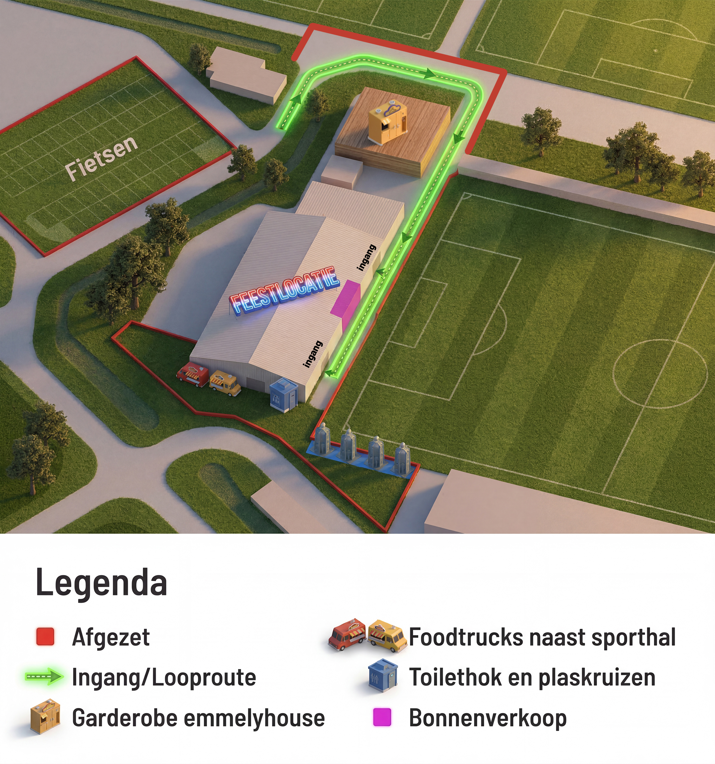 Ingang & Fietsen: Parkeer je stalen ros op het terrein naast de sporthal. De toegang is aan de achterzijde van het sportpark. Er zijn twee ingangen naar de feestzaal.
